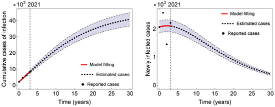 The performance of the model in fitting the Salmonella data from Saudi Arabia is depicted in Figure 2. The left panel shows the comparison between the model and the cumulative cases of infection observed, while the right panel highlights the fit for newly infected cases. Both panels demonstrate that the model successfully replicates the observed trends of Salmonella during the 2018–2021 outbreak. Table 2 provides a detailed summary of the parameter values, their ranges, and associated units that resulted in the optimal fit. Using these parameters and the approach described in Mitchell and Kribs [34], the basic reproduction number, , was calculated to be approximately . With below the threshold of 1, the results suggest that disease transmission cannot be sustained indefinitely and is likely to die out in the population over time. Figure 3 indicates that the number of newly infected cases is projected to gradually decrease, approaching zero within a few years. Consequently, the cumulative number of Salmonella cases is expected to stabilize at approximately 40,000, reaching a steady state that remains constant over time.