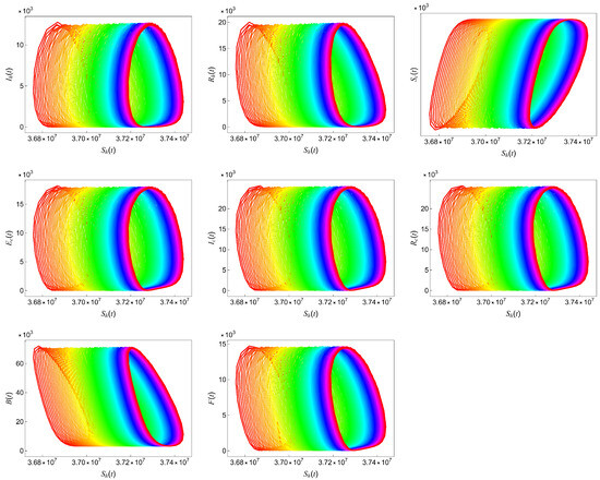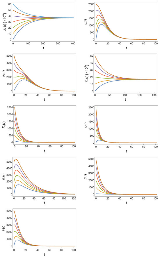 As discussed in Section 4, the basic reproduction number () is a critical threshold parameter that determines whether the disease will persist or eventually die out in the population. The results presented in Figure 4 confirm the analytical predictions. Specifically, when , the disease-free equilibrium exhibits global asymptotic stability, which ultimately leads to the extinction of the disease in the population.