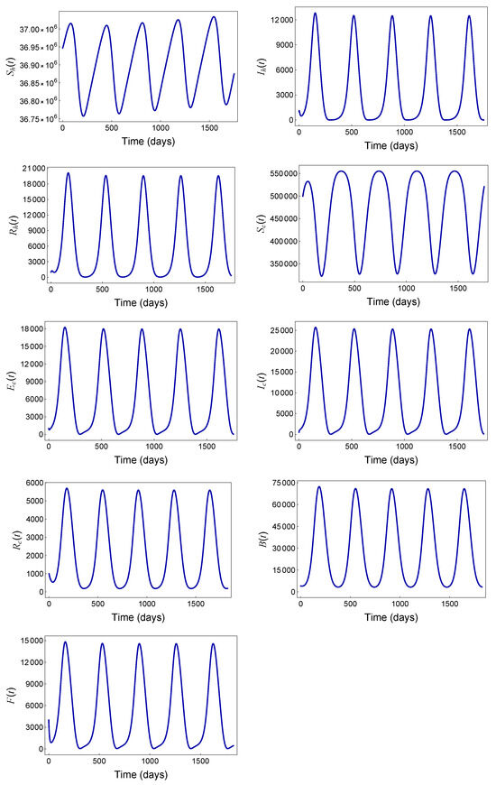 Figure 5, Figure 6 and Figure 7 illustrate the persistent dynamics of the disease when , indicating the formation of an endemic state within the population. The high value reflects persistent disease transmission, characterized by recurring annual outbreaks and the long-term stability of infection compartments. Simulations carried out using the parameter set of Table 2 further emphasize this persistence. These results demonstrate a direct link between elevated and the continued presence of infections, confirming the existence of a stable positive periodic solution, as shown in Figure 6 and Figure 7.