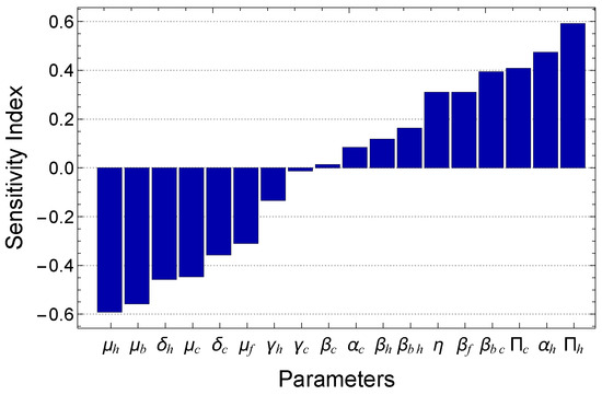 Sensitivity analysis for , using the parameter values specified in Table 2. Sensitivity indices are presented in descending order of magnitude.