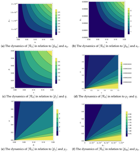 The dynamics of in relation to the environmental decay rate of Salmonella typhimurium () and the human ingestion rate () reveal contrasting effects on the spread of the disease, as shown in Figure 9f. As the ingestion rate increases, increases proportionally, indicating a higher transmission potential. In contrast, an increase in the rate of bacterial decay leads to a reduction in , highlighting its mitigating impact on secondary infections. Similarly, when examining against the food-based parameters (decay rate) and (ingestion rate), Salmonella typhimurium ingestion through contaminated food products emerges as a significant driver of disease spread, reinforcing the need for strategies targeting both environmental and food-borne pathways, as shown in Figure 9e.