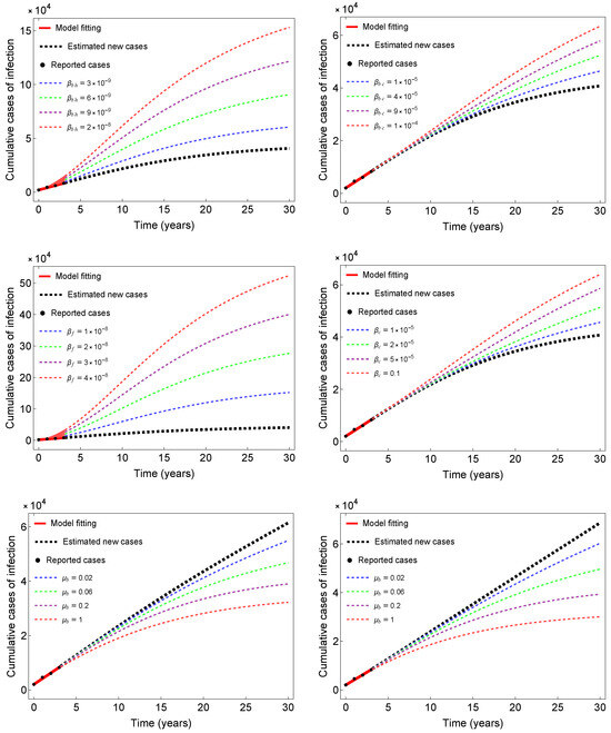 Furthermore, predictions for future Salmonella infections in Saudi Arabia, as presented in Figure 10, provide valuable information on how changes in key parameters could potentially trigger future epidemics. Our simulations indicate that increases in parameters related to transmission rates, such as bacterial ingestion rates by humans and cattle, as well as bacterial shedding rates, could significantly increase the number of infections, leading to periodic outbreaks. This highlights the importance of continuous monitoring and proactive intervention strategies to prevent large-scale epidemics.