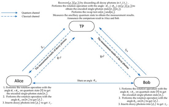 Step 2. Alice (Bob) randomly generates her (his) own secret key (. She (he) performs the rotation operation with the angle on the encoded single-photon state . The resulting single-photon state is denoted as .