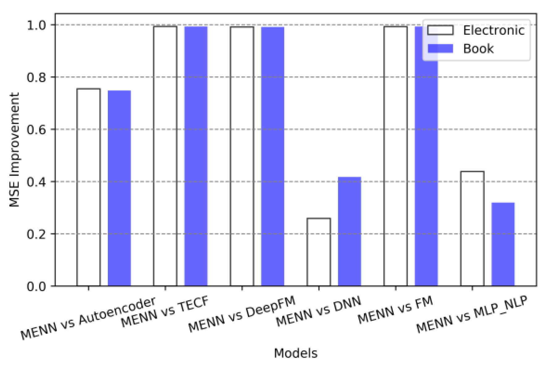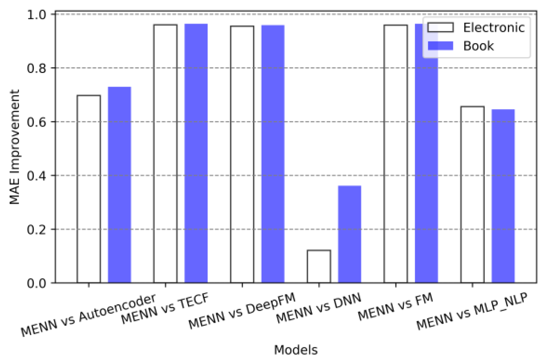 Figure 6 show the improvement rate of the MENN model compared to the other models on the two datasets “Electronic” and “Book”.