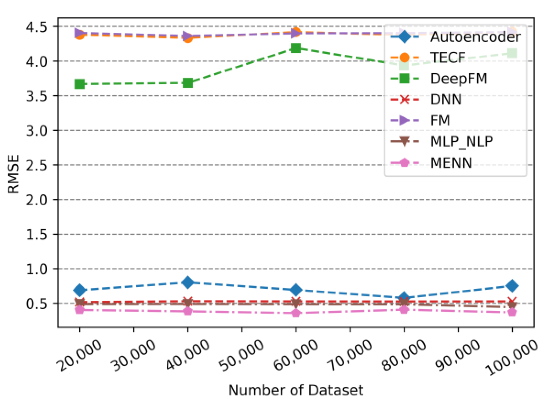 Figure 9, the changes in MENN, DNN and MLP_NLP are small as the dataset size increasing, and the advantage of these models are smaller prediction errors and better performance. The evaluation metrics of Autoencoder fluctuate slightly with dataset size. As the dataset increases, the Autoencoder’s prediction error increases. When the dataset continues to increase, the Autoencoder’s prediction error begins to decrease. Similarly, the evaluation metric values of the TECF model and the FM model with the least satisfactory performance also appear to vary as increasing dataset size. The fluctuation range of the prediction error of the DeepFM model is larger than that of other models. It is plausible that the fluctuation of DeepFM model is not only affected by the DNN model, but also by the FM model. Given the dual impact of the fluctuations of the FM and the DNN, the fluctuation range of the DeepFM is slightly higher than other models. In addition, looking at the trend in