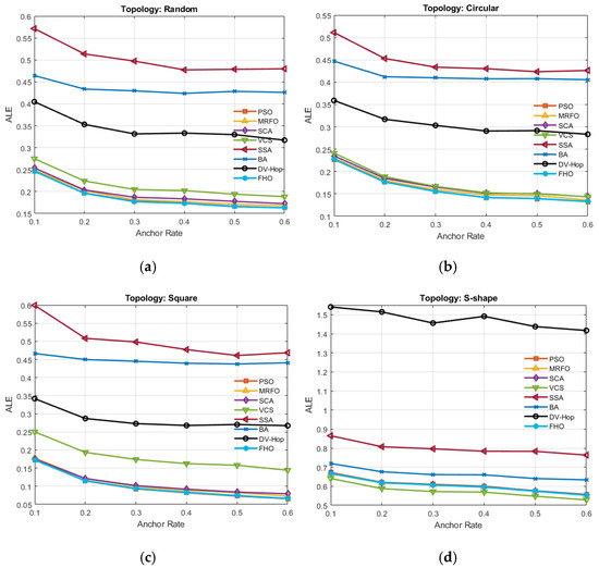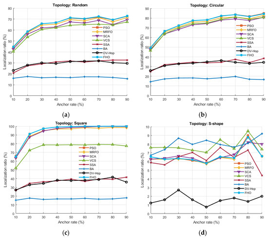 The square topology further reinforces the effectiveness of metaheuristic methods. Both PSO and FHO reach complete localization (100%) at the highest AN level, with FHO progressing from 65.27% at the lowest AN ratio. MRFO and SCA also perform reliably, exceeding 97% from 60% ANs onward. Meanwhile, VCS shows moderate improvement but plateaus at 79.13%, suggesting less affinity for grid-like structures. DV-Hop and BA continue to trail behind, with maximum localization ratios of only 36.00% and 18.00%, respectively. The S-shape topology presents the most complex scenario due to its geometric irregularity and fragmented connectivity. All algorithms experience reduced localization ratios; nonetheless, metaheuristic approaches retain a clear edge. FHO maintains stable and competitive results across AN rates, with values generally ranging between 5.80% and 6.60%, and peaking at 8.80% at 80% AN density. VCS occasionally surpasses others, achieving a maximum of 9.50%, but displays higher variability. MRFO and SCA produce results in a similar range to FHO, indicating a shared resilience in complex layouts. DV-Hop, by contrast, rarely exceeds 2%, and BA, while occasionally reaching high values like 9.20%, fails to show a consistent trend.