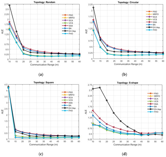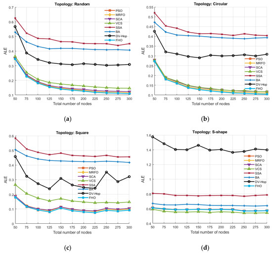 A comprehensive set of experiments was conducted to evaluate the method under fair and consistent conditions, including a deployment area of 100 × 100 m2, communication range (CR) of 30 m, and a beacon node ratio of 30%. The algorithm was benchmarked against classical DV-Hop and six widely used metaheuristics: PSO, MRFO, SCA, VCS, SSA, and BA. Performance was analyzed across four distinct topologies—random, circular, square-grid, and S-shaped—using metrics such as Average Localization Error (ALE), convergence speed, and computational time.