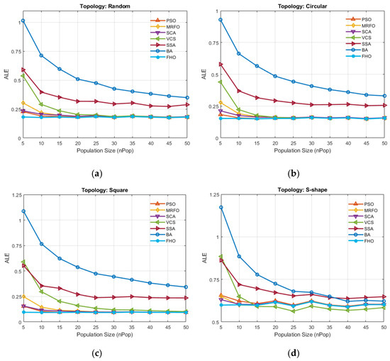 Figure 7, where FHO achieves its optimal ALE values at very low population sizes (as early as nPop < 5) and maintains this accuracy stably throughout the entire nPop range. FHO has a deterministic and adaptive structure, where each individual directly seeks the best solution when updating its position. This approach reduces the need for variation due to population size, enabling early convergence. Furthermore, because local exploitation capacity is strong, the need for exploration can be limited. This allows for near-optimal solutions to be generated even in small populations. In comparison, while other strong algorithms—such as PSO, MRFO, and VCS—tend to converge after nPop ≥ 20, their early-stage variability and occasional sensitivity to network topology distinguish FHO as the more dependable option under diverse deployment conditions.