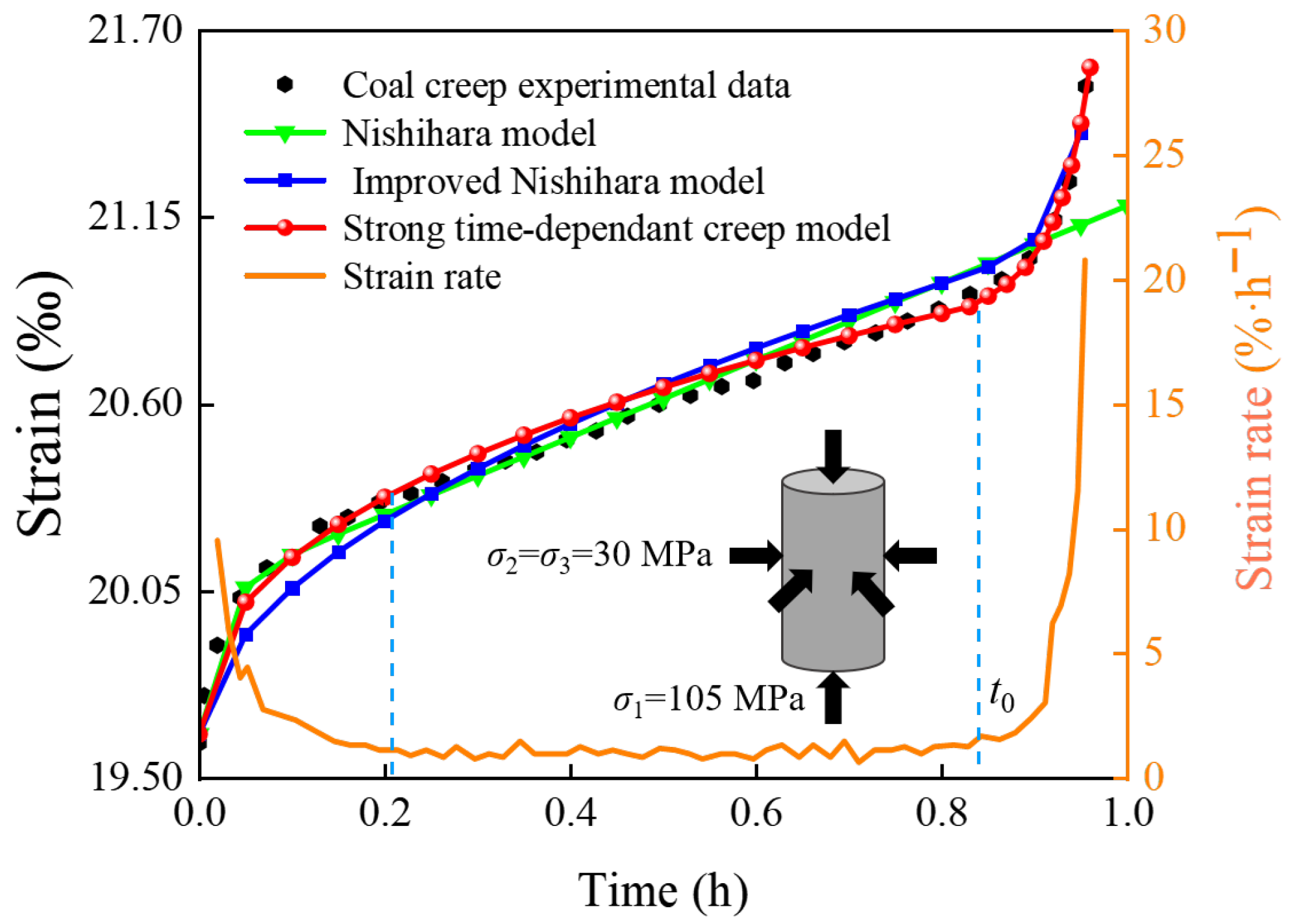 3.2. Establishment of a One-Dimensional Strong Time-Dependent Creep Model