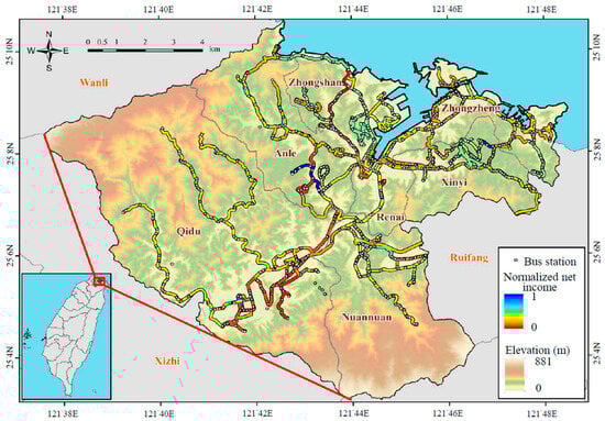 Notably, the results indicate that routes with initially low net income experienced substantial improvements when service frequencies were moderately reduced. In several cases, the percentage increase in net income was particularly pronounced, suggesting that scaling back operations on underperforming routes can effectively reduce operating costs while maintaining essential service coverage. This finding highlights the potential of demand-responsive strategies in public transport planning. Overall, the observed improvements across both high- and low-performing routes underscore the effectiveness of strategic resource reallocation in optimizing network-wide performance. The increase in the total net income of Keelung City’s urban bus system confirms that data-driven frequency adjustments can significantly enhance operational efficiency and financial sustainability. These results provide empirical support for implementing adaptive transit management strategies aimed at improving the cost-effectiveness of urban bus systems under constrained resources.