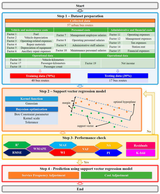 Once the model was constructed, application scenario analysis was performed, which included adjustments to bus schedules and cost structures, simulating financial outcomes under different strategies. The results indicated that adjusting the schedules of both high-efficiency and low-efficiency routes, along with reducing specific cost items, could effectively increase overall net income. Figure 3 illustrates the flowchart of this study. The following sections further elaborate on the application process and outcomes of SVR in optimizing bus performance in Keelung City.