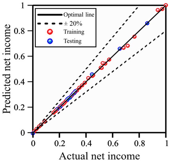 The predictive model developed in this study demonstrated exceptional performance during both the training and testing phases. Specifically, the model achieved a R2 of 0.99 and a RMSE of 7.95 × 10−3 in the training phase. Similarly, in the testing phase, it maintained an R2 of 0.99 and an RMSE of 4.47 × 10−3, indicating high accuracy and robustness. The regression results are illustrated in Figure 4. Furthermore, additional evaluation metrics—including the VAF, PI, MAE, WI, WMAPE, and NS—all reached favorable values, as presented in Table 4, further substantiating the model’s overall predictive efficacy.