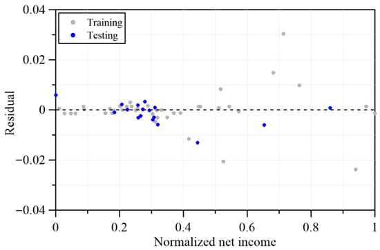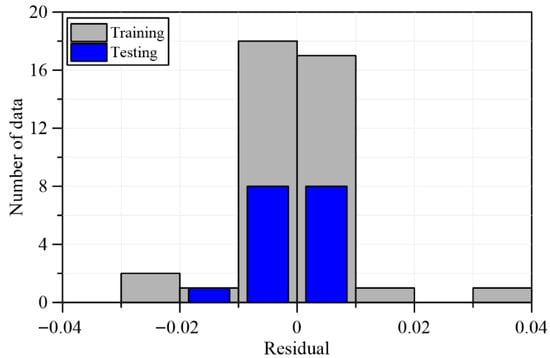 Moreover, this study conducted additional validation. The distributions of the training and testing datasets were examined through visualization (Figure 5) and were found to be highly consistent, with the majority of values concentrated within the range of 0.4 to 0.8. This similarity suggests that the model does not exhibit early convergence or entrapment. In addition, residual error distributions were analyzed for both datasets (Figure 6). The training residuals predominantly ranged between −0.02 and 0.02, whereas the testing residuals ranged between −0.04 and 0.04. The absence of systematic deviations or clusters of extreme errors further indicates that the model is not subject to overfitting.