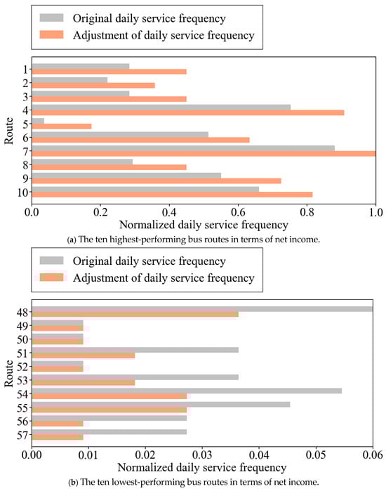 where denotes the number of daily service frequency for bus route i, and represents the maximum number of daily service frequency among all bus routes. In this study, Equation (9) normalizes service frequency relative to the maximum observed value to ensure a consistent comparison across routes and to avoid bias toward high-frequency services. As shown in Table 2, we examined that the maximum frequency was not an outlier, thereby minimizing the risk of distortion. Moreover, the analysis emphasizes relative changes in service frequency before and after adjustment rather than absolute values, ensuring that the normalization does not compromise the validity of the policy implications. The adjustment strategy involved increasing the service frequency for high-performing routes, specifically Routes 1 through 10, as shown in Figure 7a, while moderately reducing or maintaining the frequency for low-performing routes, namely Routes 48 through 57, as illustrated in Figure 7b.