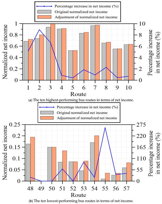 Figure 8 shows the comparison of net income before and after service frequency adjustment. The x-axis indicates the corresponding bus routes, while the y-axis on the left represents the normalized net income, as formulated in Equation (10):