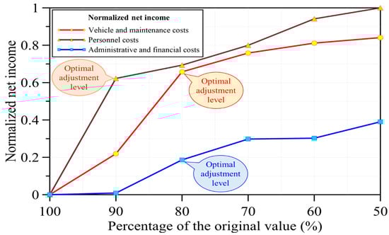 According to the analysis results illustrated in Figure 9, the optimal cost-efficiency points for the three cost categories can be identified at specific adjustment levels. For vehicle and maintenance costs, the most favorable outcome is achieved when costs are adjusted to 90% of the original value. For personnel costs, the optimal adjustment level is 80%, yielding the greatest improvement in net income. Similarly, for administrative and financial costs, adjusting to 80% also results in the highest net benefit.
