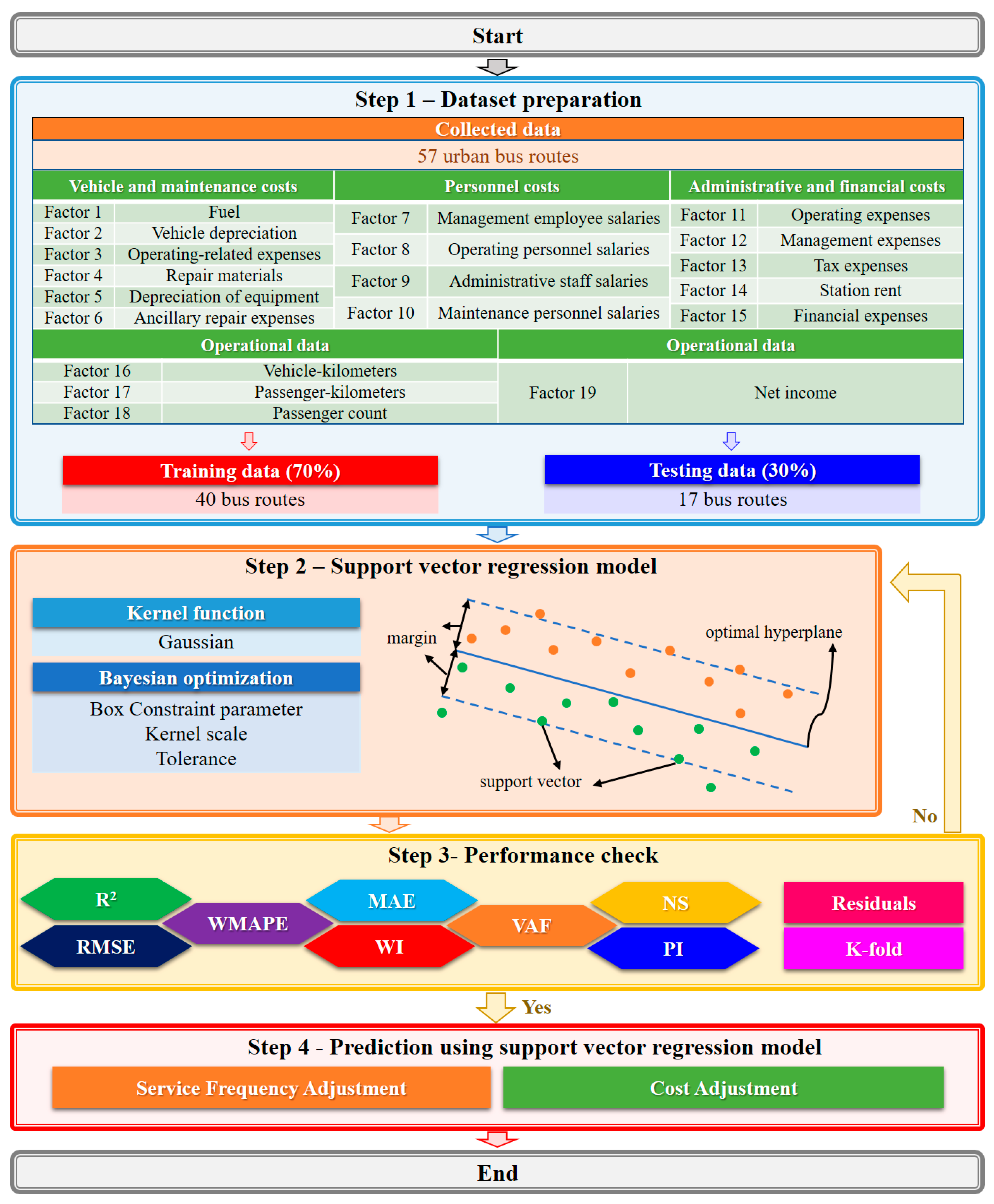 In this study, the SVR model was employed to develop a regression model for bus net income. The SVR is an extension of the support vector machine for regression tasks [