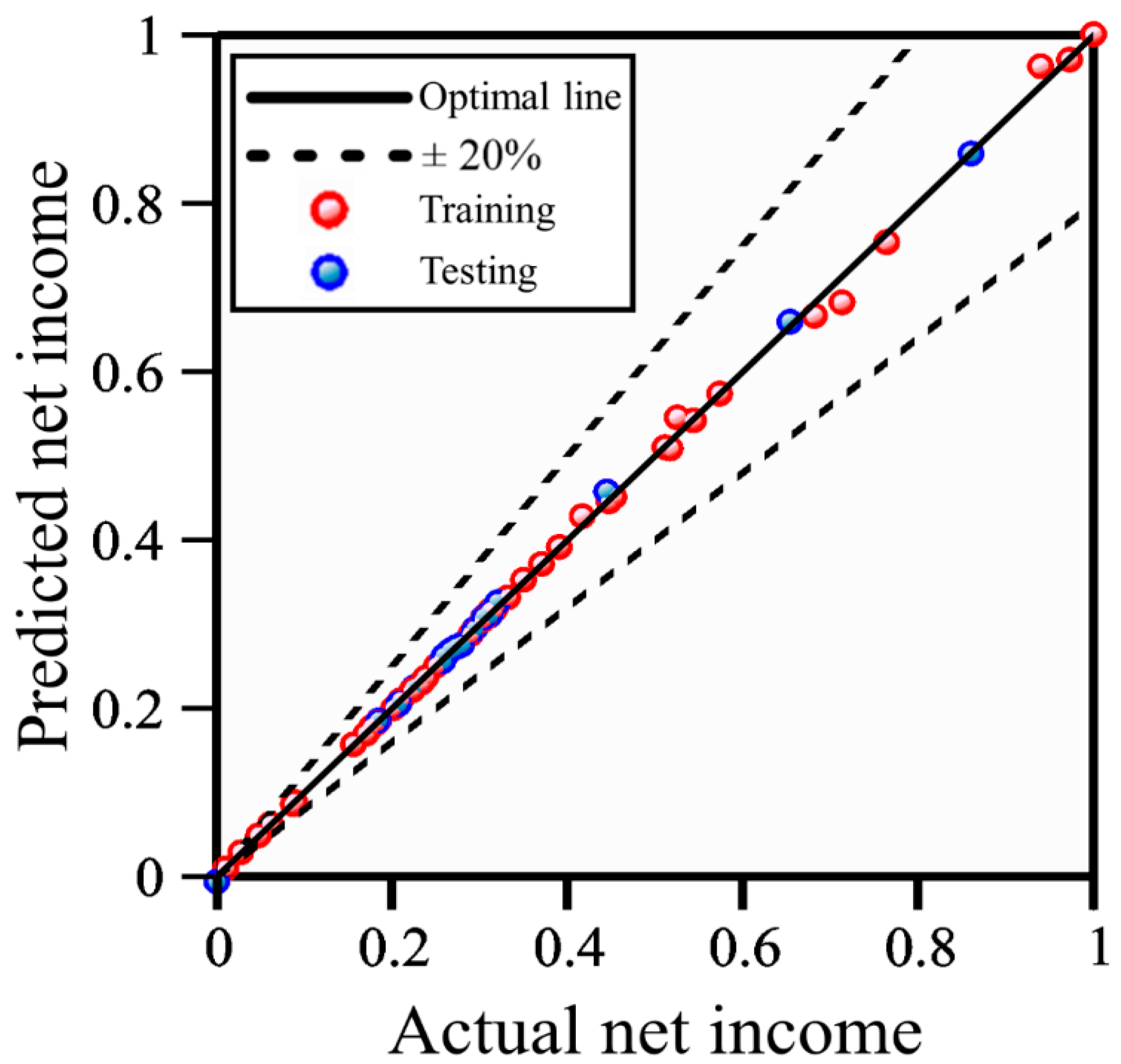 Figure 9 presents the cost-adjustment net income prediction chart. The x-axis of
