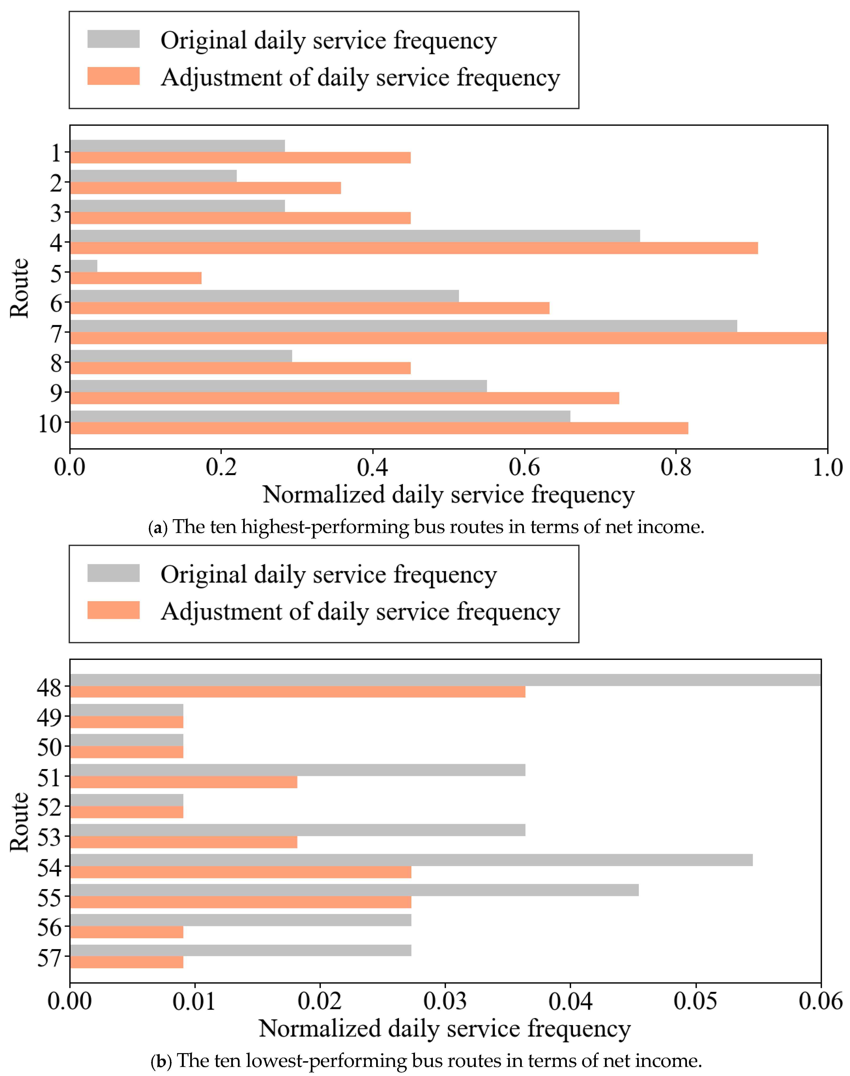 Table 2, we examined that the maximum frequency was not an outlier, thereby minimizing the risk of distortion. Moreover, the analysis emphasizes relative changes in service frequency before and after adjustment rather than absolute values, ensuring that the normalization does not compromise the validity of the policy implications. The adjustment strategy involved increasing the service frequency for high-performing routes, specifically Routes 1 through 10, as shown in