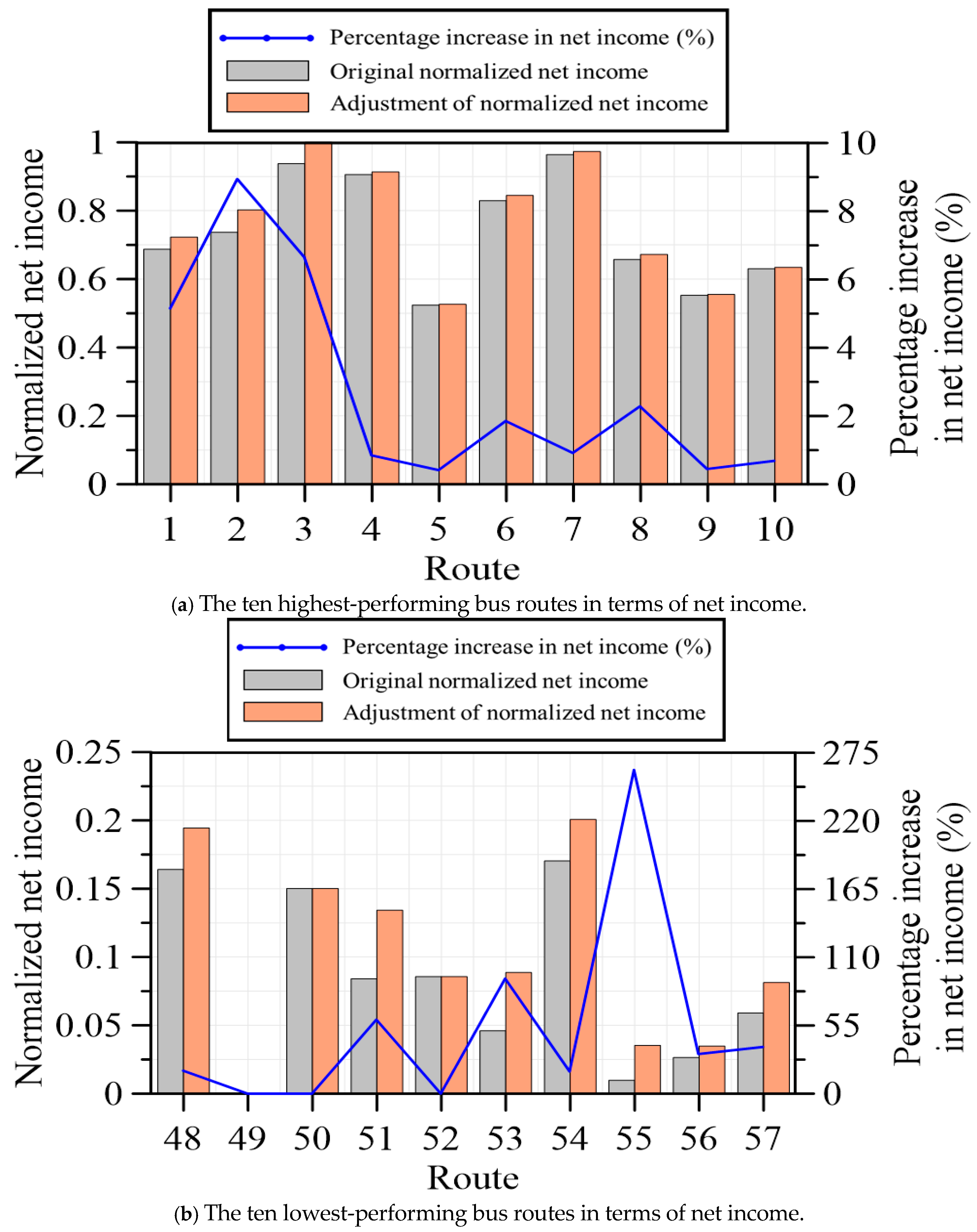 Figure 8a presents a comparative analysis of net income before and after adjustment for the ten highest-performing bus routes, revealing moderate yet consistent gains in profitability.