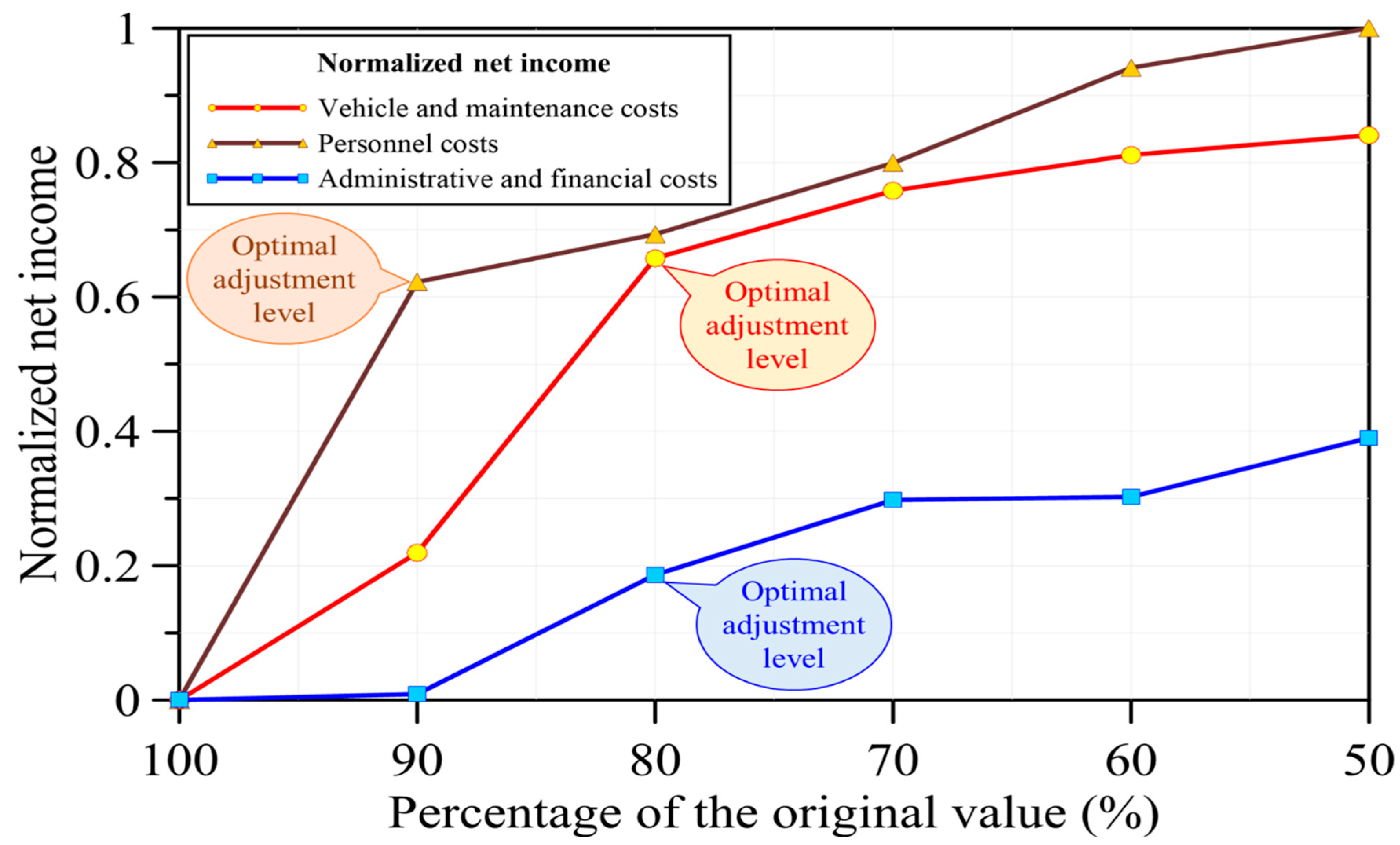 Figure 9 represents the percentage of the original value, indicating various levels of cost adjustment. Cost adjustments include three major categories: vehicle and maintenance costs, personnel costs, and administrative and financial costs. The percentages range from 100% to 50%, where 100% denotes the original (baseline) cost level, and lower percentages (e.g., 90%) represent cost reductions—such as 90% indicating a 10% decrease in the respective cost category, and so forth. The y-axis of
