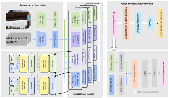 Our model is based on the pre-trained CLIP framework [42], which provides initial semantic representations for both text and image inputs. These representations are projected into a shared latent space and then processed through a Mixture-of-Experts module composed of four expert types: