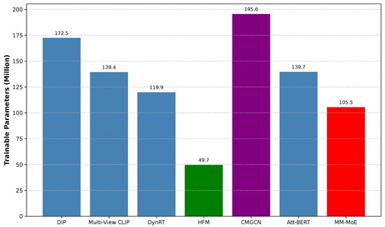 As presented in Figure 5, our MM-MoE model, with approximately 105.5 million trainable parameters, embodies this principle of simplicity and efficiency. This marks a significant reduction in complexity compared to many other high-performing multi-modal methods. For instance, our model is considerably more lightweight than complex architectures like CMGCN (195.6 M) and DIP (172.5 M). It also maintains a smaller parameter footprint than other strong baselines like Multi-View CLIP (139.4 M) and Att-BERT (139.7 M).
