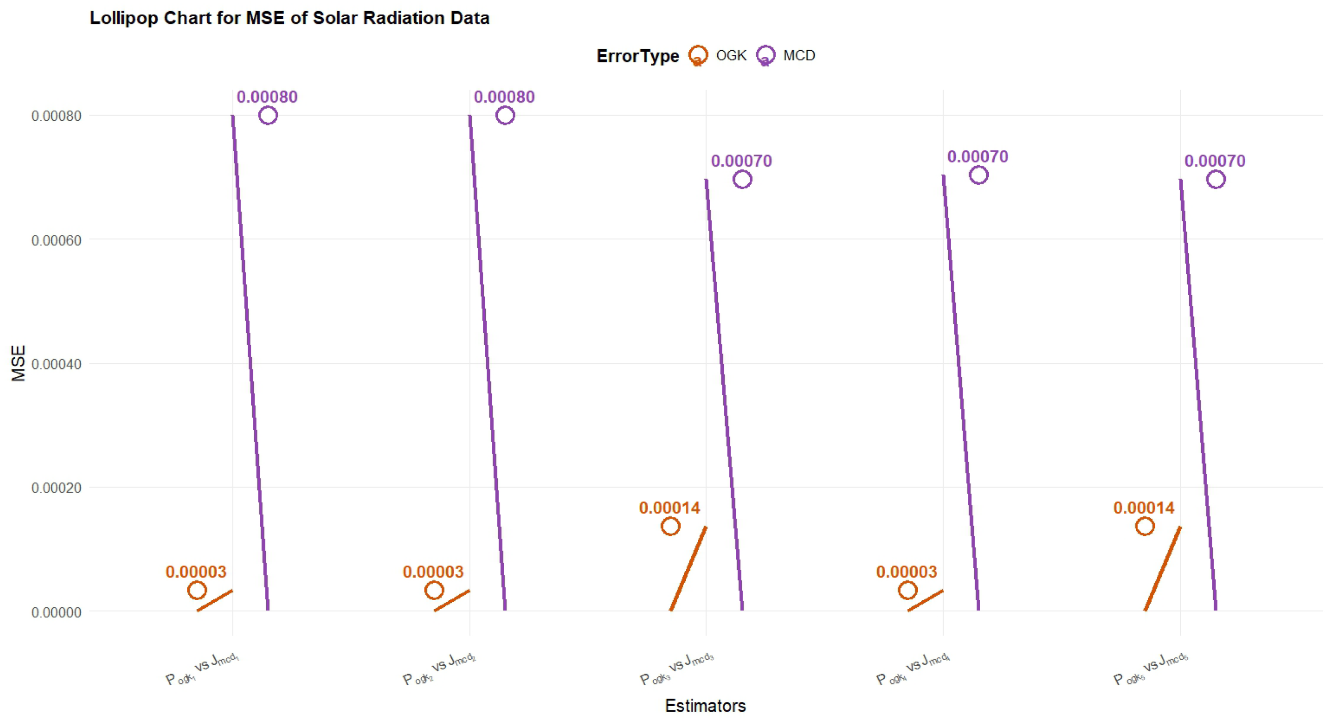 - Table 2 presents the MSE of estimators and () on real data regarding solar radiation. Among the MCD-type estimators, with the lowest MSEs were found to be , , and , which were about , demonstrating greater robustness and reduced variability. On the contrary, the OGK-type estimators have smaller MSEs in general, with the lowest MSEs being as low as , especially in the case of and . This implies that exponential-type estimators , which are built in OGK-based robust covariance structures, are much more precise than MCD-type estimators when real-world data are provided, comprising solar radiation and auxiliary temperature variables.