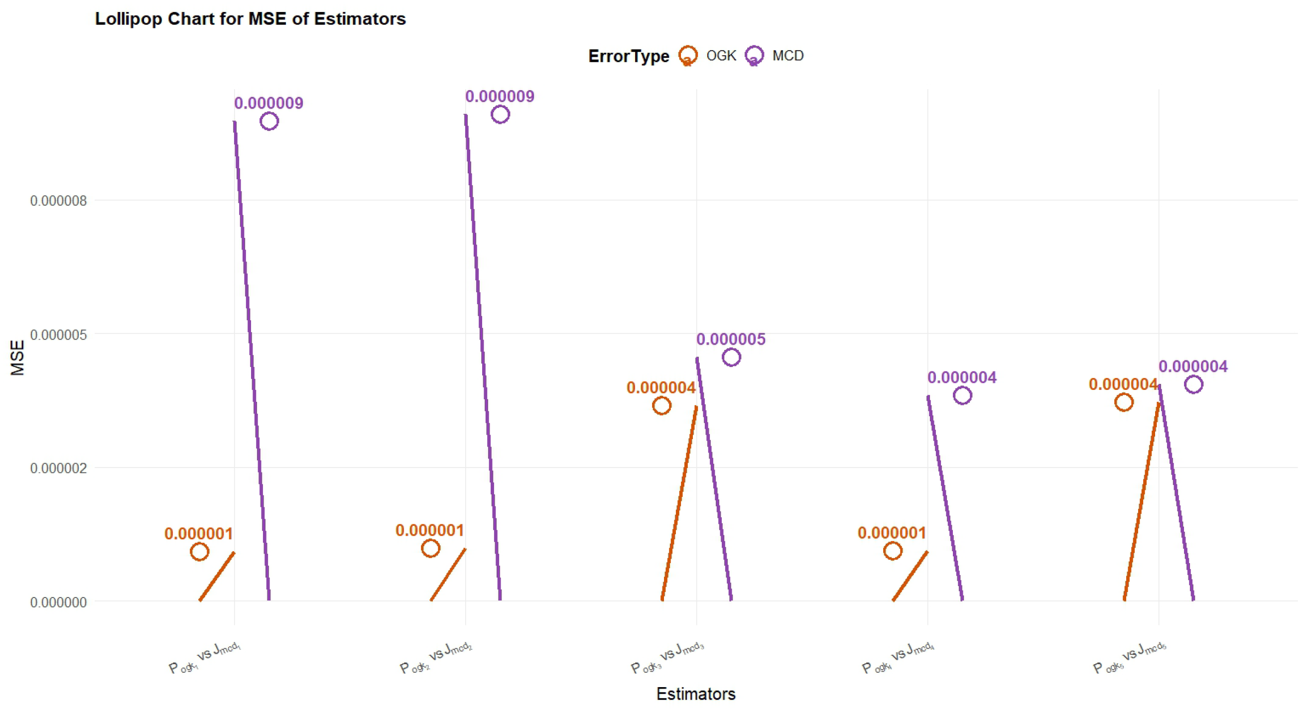 - Table 4 shows the results of the MSE obtained via simulation, considering real-world contamination and structural variance replication. Simulation further establishes the excellent performance of estimators, which once again prove to have lesser MSE values when compared to their respective estimators. Specifically, the MSEs reported by , , and are so low (in the range of the order of ) that their reliability is justified in controlled experiments. OGK-type estimators perform best compared to any of the MCD-type estimators, although and are the best MCD-type estimators. These results indicate that the proposed estimators not only work well on real data but they are also highly robust in simulated conditions with outlier contamination.