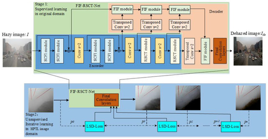 The proposed novel HPTL image dehazing neural network, FIF-RSCT-Net, is illustrated in Figure 1. The acquisition of dehazing knowledge is implemented through supervised and unsupervised iterative learning stages.
