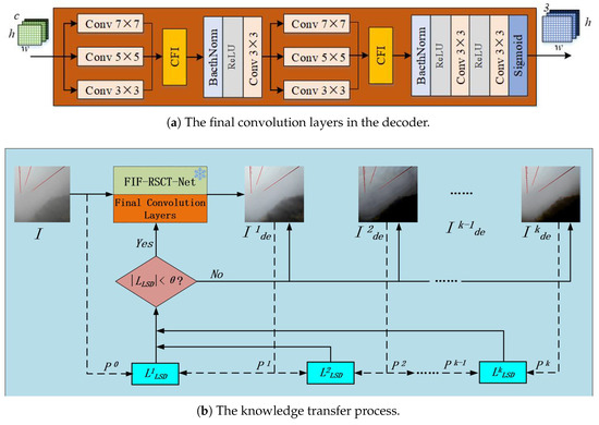 It is important to note that the decoder incorporates the final convolution layers to restore the image. These layers will be fine-tuned during the dehazing knowledge transfer with unsupervised iterative learning. The final convolution layers follow a conventional structure that is illustrated in Figure 6a.