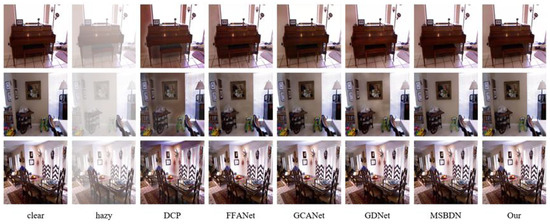 The SOTS dataset contains synthetically generated haze effects applied to both indoor and outdoor scenes. The image dehazing results for indoor images are shown in Figure 7.