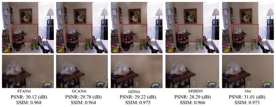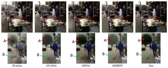 As shown in Figure 8, the white wall region, marked with a red box, exhibits noticeable dark blocks in the dehazed results of GDNet, GCANet, and FFANet. Although these artifacts are significantly reduced in MSBDN, the brightness is elevated slightly. Therefore, our method achieves the best dehazing performance.