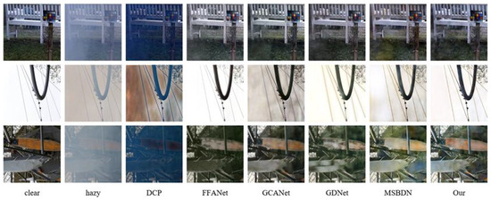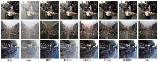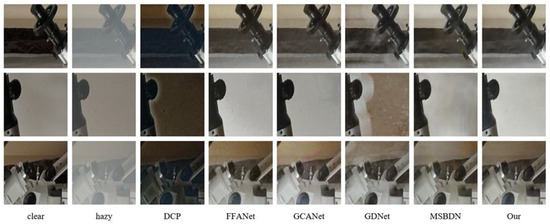 The dehazing results for outdoor images from the SOTS dataset are presented in Figure 9. It is obvious that the DCP fails to restore the sky region naturally, introducing noticeable artifacts. The details comparative analysis of the other algorithms are provided in Figure 10.