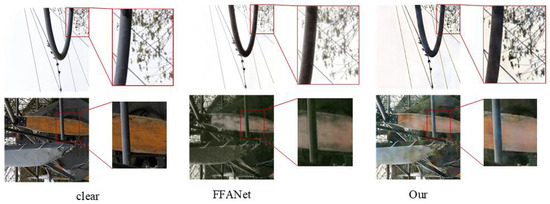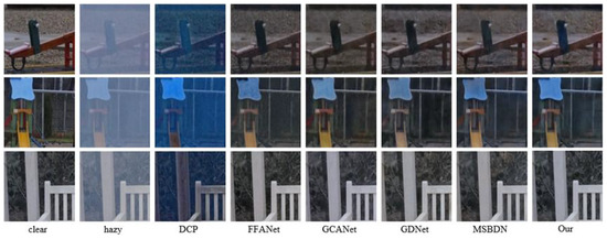The comparative experiment results are presented in Figure 11 and Figure 12 respectively. As we can find, FFANet, GCAet, MSBDN, and our method demonstrate effective dehazing performance. However, in Figure 11, MSBDN and FFANet exhibit slight darkened patches in the white background regions. In Figure 12, the four algorithms show no significant differences in dehazing performance through subjective evaluation.