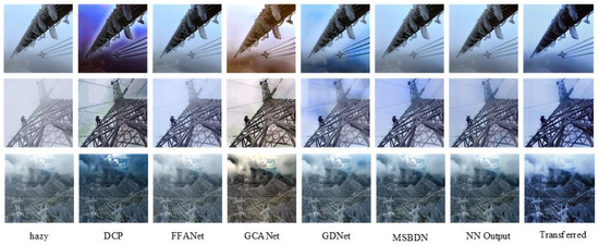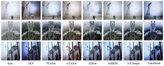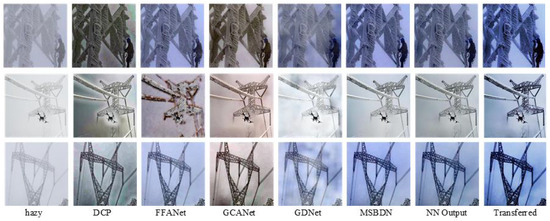 The supervised learning datasets include I-Haze [59], O-Haze [60], NH-Haze [61], and SOTS [62]. Among which, I-Haze, O-Haze, and NH-Haze are the natural hazy environment datasets, while SOTS is the synthetic hazy image dataset. In the dehazing knowledge transfer step, the natural HPTL images with different concentrations are applied to iteratively fine-tuning the dehazing neural network. In the experiment, five classical dehazing algorithms, DCP, FFANet [63], GCANet [64], GDNet [65], and MSBDN [66], are introduced for comparative analysis.