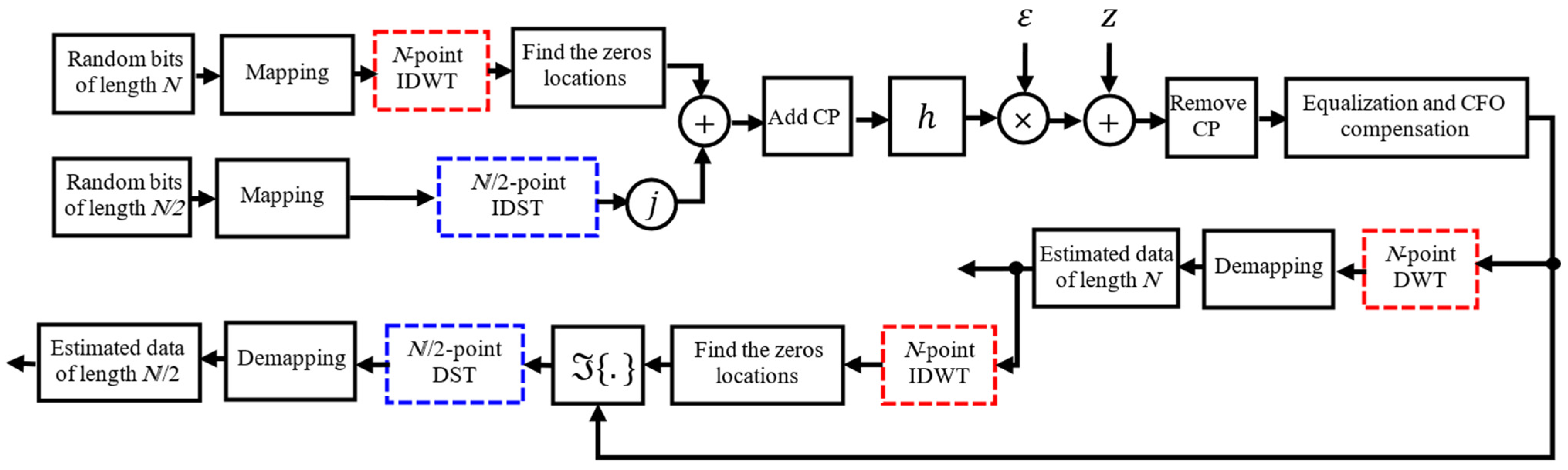 Dual Modulation via IDWT and IDST | zero elements to transmit additional data (imaginary part), increasing throughput by 50% | Requires precise synchronization between real and imaginary paths; implementation complexity |