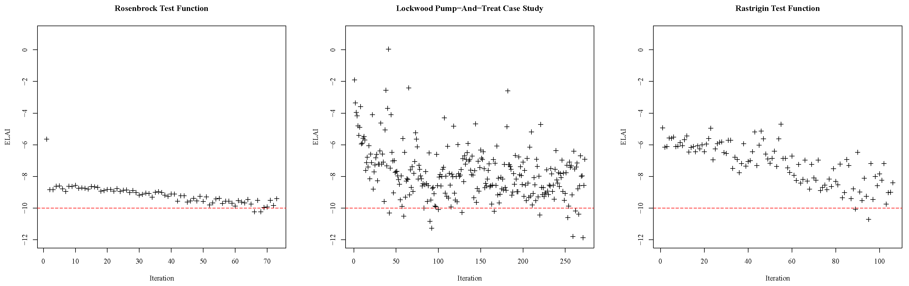 The size of the control window, w, may vary from problem to problem based on the difficulty of optimization in each case. A reasonable way of choosing w is to consider the number of observations necessary to establish a standard of control. In this setting, w is a kind of sample size, and as such the choice of w will naturally increase as the variability in the ELAI series increases. Just as in other sample size calculations, the choice of an optimal w must consider the cost of poor inference (premature identification of convergence) associated with underestimating w, against the cost of over sampling (continuing to sample after convergence has occurred) associated with overestimating w. Providing a default choice of w is somewhat arbitrary without careful analysis of the particulars of the objective function behavior, the costs of each successive objective function evaluation, and the users’ risk tolerance to prematurely declaring convergence.