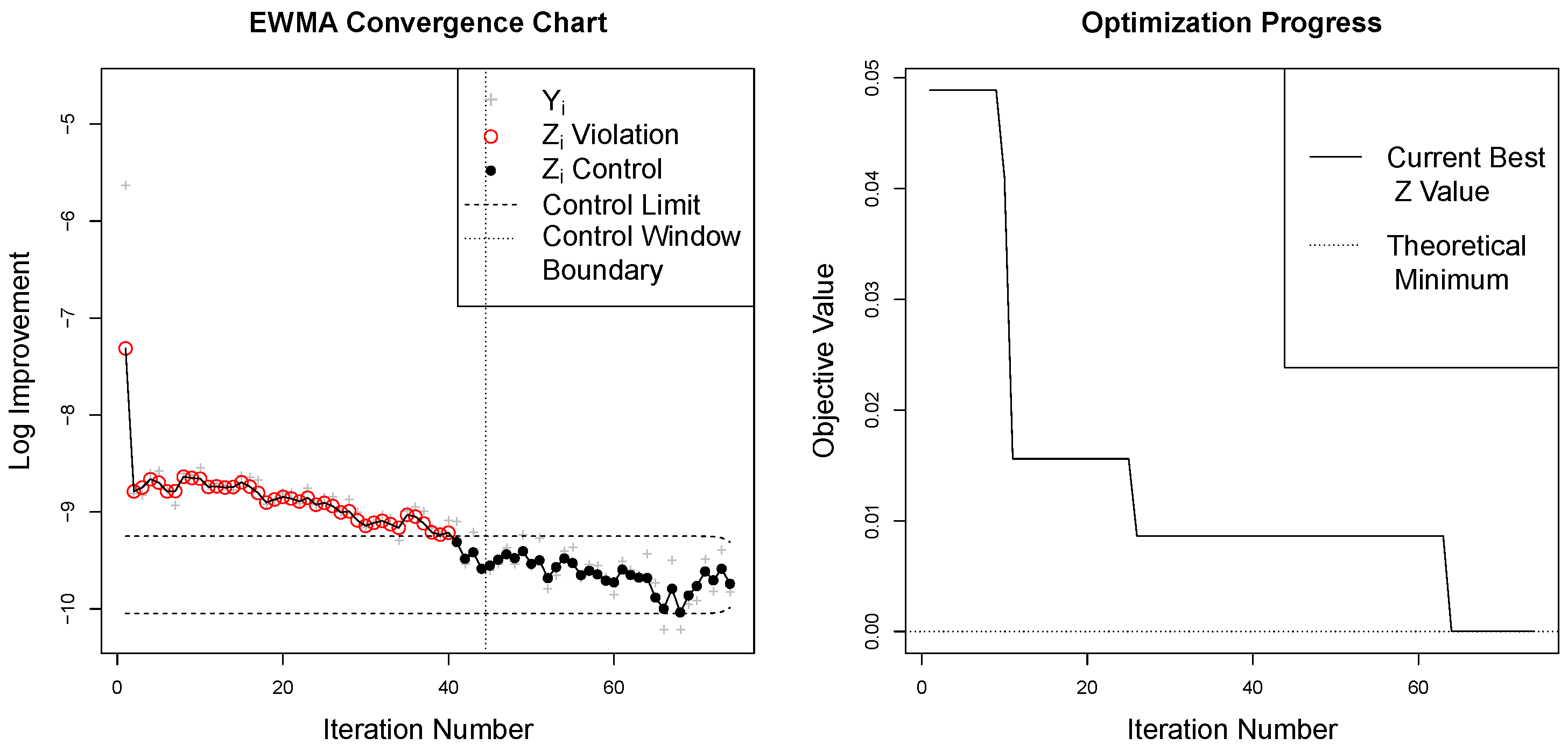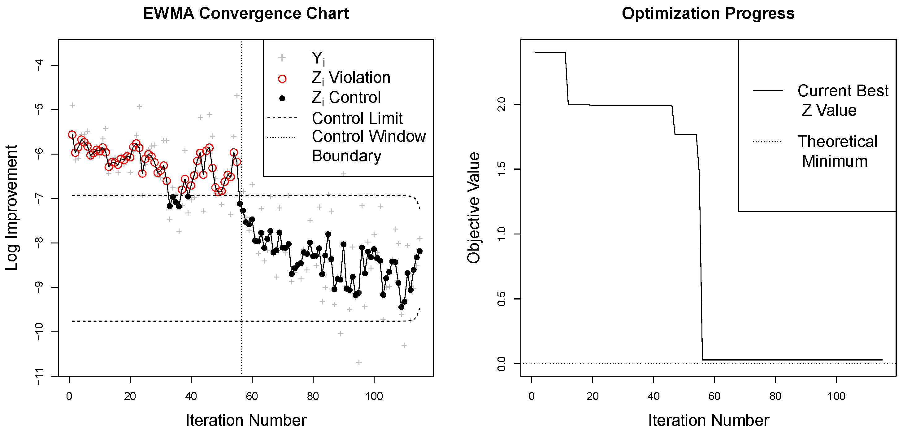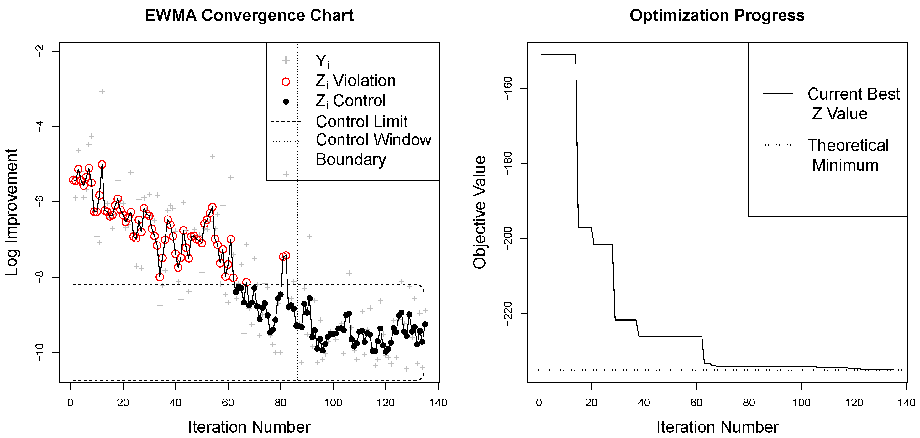 It is important to note that we are not performing traditional SPC in this context, as the EI criterion will be stochastically decreasing as an optimization routine proceeds. Only when convergence is reached will the EI series look approximately like an in control process. Thus, our perspective is completely reversed from the traditional SPC approach—we start with a process that is out of control, and we determine convergence when the process stabilizes and becomes locally in control. An alternative way to think about our approach is to consider performing SPC backwards in time on our EI series. Starting from the most recent EI observations and looking back, we declare convergence if the process starts in control and then becomes out of control. This pattern generally appears only when the optimization has progressed and reached a local mode without other prospects for a global mode. If the optimization were still proceeding, then the EI would still be decreasing and the most recent iterations of optimization would not appear to be in control.