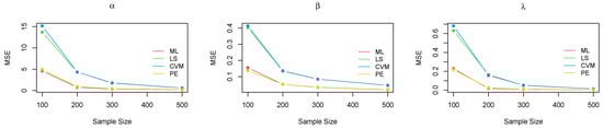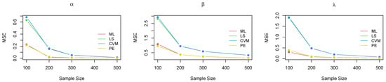 The above tables and figures show that, for small samples, the bias and MSE were high for all approaches, particularly for the parameter . For and , however, all methods performed better, with a slightly higher MSE for the ML method. As the sample size increased, there was a dramatic improvement in all the estimation methods, with a considerable reduction in both the bias and MSE for all parameters. By , the consistency property was achieved across all the estimation techniques, with a noticeable decrease in the MSE for all parameters. The ML method became much more stable, followed by the PE method. The LS and CVM methods were further enhanced with a high bias and MSE compared with ML and PE in most scenarios. Thus, they can be considered acceptable alternatives to the ML and PE approaches, despite being less efficient.