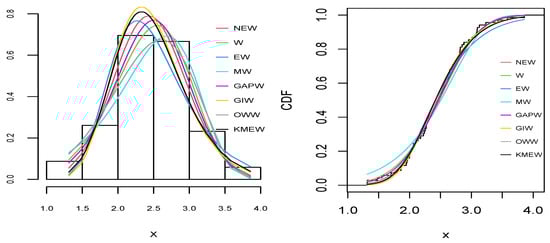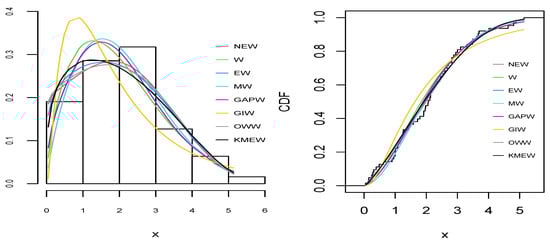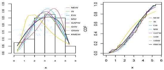 This section compares the adequacy of the NEW distribution in fitting real data with the selected competitors by focusing on the relative performance with respect to goodness-of-fit indices and the predictive accuracy. The acquired information criteria are the following: the Akaike information criterion (AIC), Bayesian information criterion (BIC), Hannan–Quinn information criterion (HQIC), corrected Akaike information criterion (AICc), consistent Akaike information criterion (CAIC), and Kolmogorov–Smirnov (KS) test with its p-value. It is worth mentioning that the KS statistic is calculated using the estimated parameters; thus, its p-value should be interpreted as approximate. The utilization of these criteria is motivated by their distinct objectives and penalty structures, which allow for a more comprehensive model assessment. The results are shown in Table 9, Table 10, Table 11, Table 12 and Table 13 and Figure 6, Figure 7, Figure 8, Figure 9 and Figure 10.