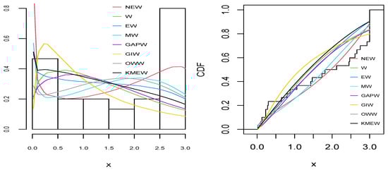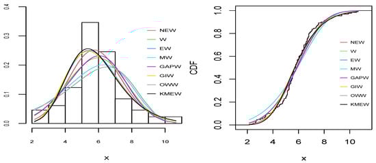 As can be seen from Table 9, Table 10, Table 11, Table 12 and Table 13 and Figure 6, Figure 7, Figure 8, Figure 9 and Figure 10, the NEW distribution achieves a minimum value of all information criteria and a higher p-value among all distributions. This indicates the good ability of the NEW distribution to fit the data accurately compared with other extensions of the Weibull distribution.