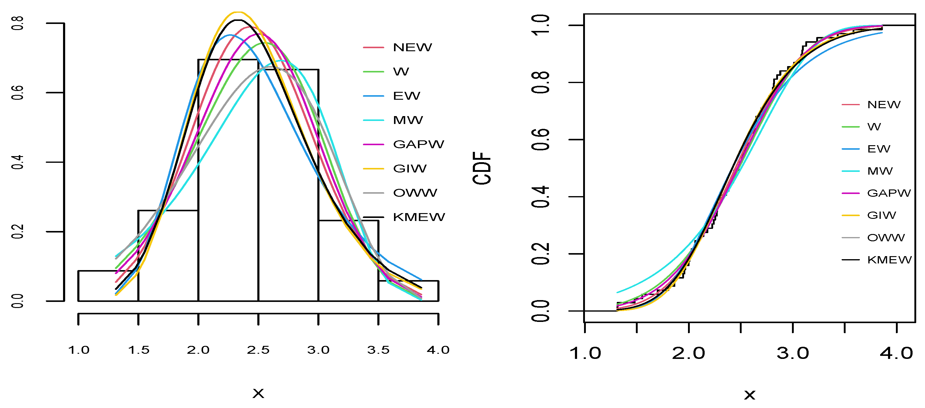 - Alshanbari, H.M.; Ahmad, Z.; El-Bagoury, A.A.A.H.; Odhah, O.H.; Rao, G.S. A new modification of the Weibull distribution: Model, theory, and analyzing engineering data sets. Symmetry 2024, 16, 611. [Google Scholar] [CrossRef]