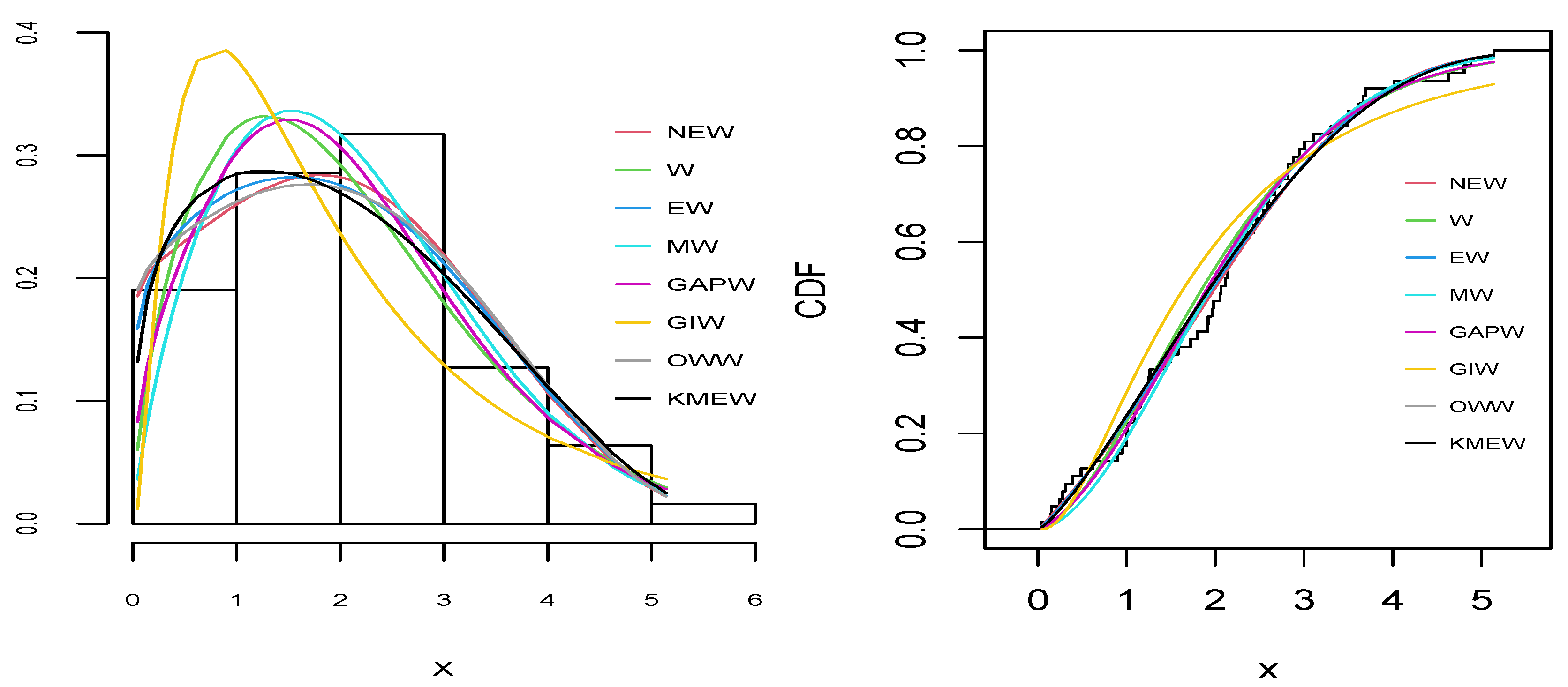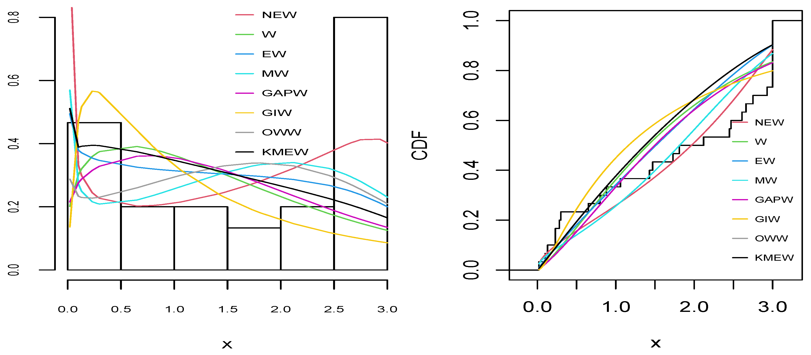 - Mudholkar, G.S.; Srivastava, D.K. Exponentiated Weibull family for analyzing bathtub failure-rate data. IEEE Trans. Reliab. 1993, 42, 299–302. [Google Scholar] [CrossRef]