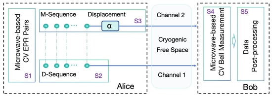 As shown in Figure 1, the details of the two-step CV- QSDC protocol are demonstrated. Without loss of generality, the first and second free space channels have the same channel parameters in the cryogenic condition (e.g., transmittance and thermal noise). The sender, Alice, generates and sends the microwave-based Einstein–Podolsky–Rosen (M-EPR) states through the cryogenic free space, to the receiver, Bob. The microwave-based scheme for the CV-QSDC can be designed as follows.
