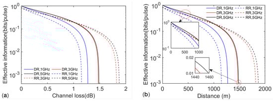 While taking into account the lossy channel, we evaluate the effective information capacity of the communication process for microwave signals at different frequencies by employing either the DR or RR scheme, as shown in Figure 2a. We find that the DR scheme performs better under low channel loss. However, as the channel loss increases, the RR scheme exhibits better performance compared to the DR scheme. This is consistent with the underlying principles of the DR and RR schemes. When the channel loss increases, the signal received by Bob becomes weaker, leading to larger measurement errors in the DR scheme. In other words, as the channel loss grows, the amount of effective information in the DR scheme decays more rapidly than in the RR scheme.