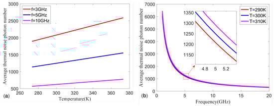 The variation curve of the average thermal noise photon number with (a) microwave frequency and (b) ambient temperature.