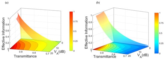 Performance of the effective information of the microwave-based CV-QSDC for the DR scheme (a) and the RR scheme (b). It also shows the relationship between the effective information of the system and the protocol modulation variance and channel transmittance .