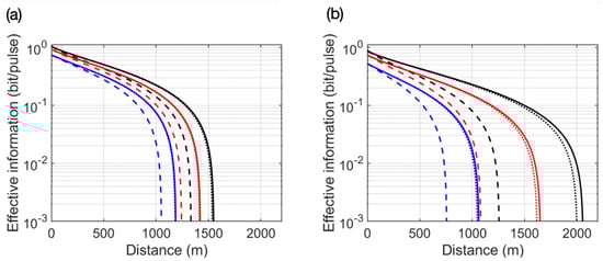The effective information for the communication process is a function of the transmission distance using the DR and RR algorithm. (a,b) Relationship between effective information and transmission distance for ideal conditions, with multiple different frequency correspondences. From left to right, the dashed, dotted, and solid lines indicate signals with frequencies of 1 GHz, 3 GHz, and 5 GHz, respectively. While the type of line corresponds to the information code length used, blue, red, and black lines correspond to N = , and system asymptotic effective information, respectively.