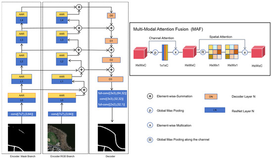 The DRMNet road extraction model was developed based on the LinkNet framework. First, we proposed a dual-branch encoder structure, with each encoder comprising a 7 × 7 convolution layer with a stride of 2 and five ResNet [39] residual modules. The dual-branch encoder takes a 512 × 512 RGB image and a coarse MASK image as inputs; this coarse MASK can be generated either by a single-branch DRMNet or by other road segmentation models. The pretrained network uses ResNet-34, and each Encoder-block in both encoders employs the MAF module for refined feature extraction. The fused features are then passed to the next block in the RGB branch. The MAF module enhances the model’s information extraction ability from both channel and spatial perspectives, improving multi-level feature extraction and integration. In the decoding stage, a residual structure is used with 1x1 convolution kernels to reduce computational complexity, while full convolution restores the image to its original size. The DRMNet network structure is shown in Figure 1.